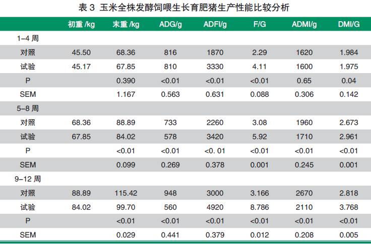 2)玉米全株發(fā)酵后,按55% ~ 75%比例替代生長育肥豬日糧,濕料基礎(chǔ)采食量增加,干物質(zhì)采食量減少,增長速度有所減慢,出欄體重有所減少。