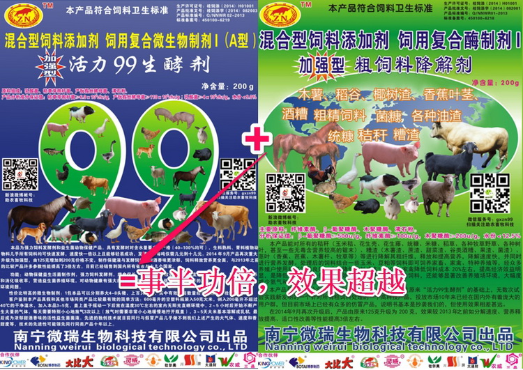 如果是兩都結(jié)合起來用,則活力99生酵劑25克,加粗飼料降解劑100克,可以處理600公斤秸稈料,一天即可使用。喂養(yǎng)效果更好一些。