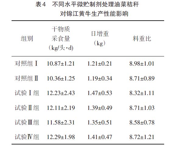 從表4可見(jiàn),試驗(yàn)Ⅰ組的干物質(zhì)采食量、日增重最大,料重比最低,而對(duì)照Ⅱ組的的干物質(zhì)采食量、日增重最小。無(wú)論是采食量、日增重還是料重比,各種差異均不顯著(P>0.05)。因此,以試驗(yàn)Ⅰ組即按照油菜秸稈∶皇竹草=3∶7,添加150mg/kg乳酸糞腸球菌制作的混合微貯料飼喂錦江黃牛效果最好。