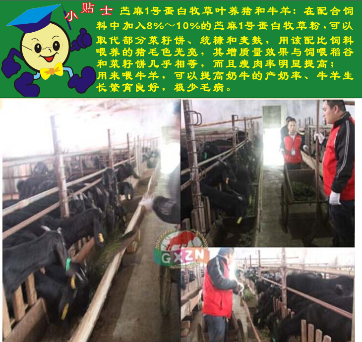 苧麻1號蛋白牧草葉養(yǎng)豬和牛羊: 在配合飼料中加入8%~10%的苧麻1號蛋白牧草粉,可以取代部分菜籽餅、統(tǒng)糠和麥麩,用該配比飼料喂養(yǎng)的豬毛色光亮,其增質(zhì)量效果與飼喂稻谷和菜籽餅幾乎相等,而且瘦肉率明顯提高; 用來喂牛羊,可以提高奶牛的產(chǎn)奶率、牛羊生長繁育良好,極少毛病。