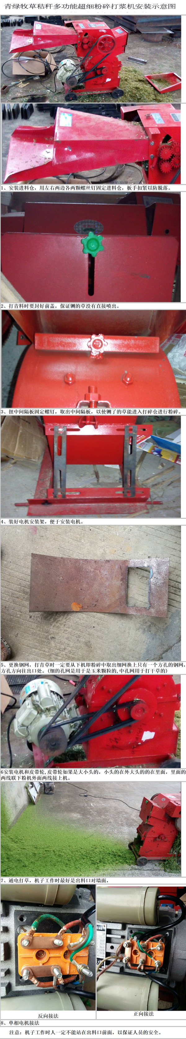 型號分單相電和三相電,單相電使用電機功率為4.5KW,建議從電表處直接接線確保線徑功率。推薦使用三相電。各種禾本科如新型皇竹草、糖蔗2號牧草等、青玉米秸稈等均可加工。使用單相電切超細(xì)時產(chǎn)約6百公斤,打漿約4百公斤,使用三相電產(chǎn)量更高。2人配合使用能夠提高效率。