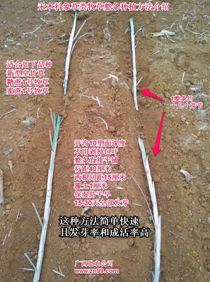 禾本科象草類牧草一般采用種莖繁殖(跟甘蔗一樣),將種莖埋入1厘米的土層下,保持土壤濕潤(rùn),日平均氣溫在22℃以上時(shí),15天左右有50%發(fā)芽,40%左右需要在30天左右才能全部發(fā)芽,10%左右可能由于多種因素不能發(fā)芽。在幾個(gè)牧草品種比較中,新型皇竹草發(fā)芽最快,其次是臺(tái)灣甜象草,糖蔗1號(hào)牧草和蜜蔗1號(hào)牧草發(fā)芽稍慢于前兩者。