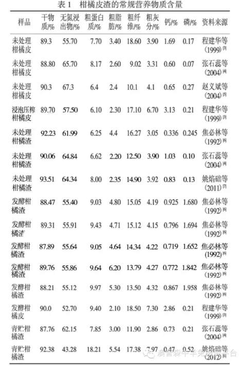 近年來,研究人員對未處理柑橘皮渣、浸泡壓榨柑橘皮、青貯和發(fā)酵柑橘皮渣的常規(guī)營養(yǎng)物質含量進行了測定(1)。結果表明,鮮柑橘皮渣的水分含量高,風干后無氮浸出物、粗纖維和鈣含量較高,但粗蛋白質和總磷含量低。通過青貯、發(fā)酵,降低了鮮柑橘皮渣的水分,提高了粗蛋白質、粗脂肪和總磷含量。