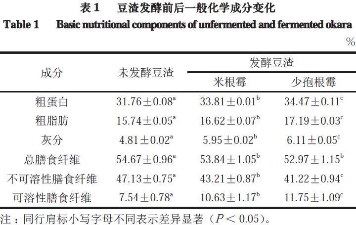 對(duì)未發(fā)酵豆渣及由米根霉、少孢根霉發(fā)酵的豆渣冷凍干燥后,進(jìn)行粗蛋白、粗脂肪、灰分、膳食纖維含量的測定(表1)。未發(fā)酵的豆渣蛋白質(zhì)含量為31.76%,經(jīng)過米根霉、少孢根霉發(fā)酵后,蛋白質(zhì)含量分別提高至33.81%、34.47%。同時(shí)粗脂肪、灰分的含量也有所提高。一方面由于伴隨著微生物的生長,霉菌菌絲覆蓋整個(gè)豆渣表面,霉菌菌絲與豆渣基質(zhì)合二為一,菌絲中的粗蛋白、粗脂肪、灰分均能夠引起發(fā)酵豆渣中相應(yīng)含量的提高。另一方面發(fā)酵過程中隨著微生物生長,豆渣中的部分物質(zhì)被微生物當(dāng)做碳源利用,導(dǎo)致其他營養(yǎng)成分的比例發(fā)生改變,從而導(dǎo)致發(fā)酵后其化學(xué)成分的含量發(fā)生改變。如微生物在發(fā)酵過程中將豆渣中的某些營養(yǎng)物質(zhì)降解為一些小分子物質(zhì),如醇和酸發(fā)生酯化反應(yīng),形成酯類物質(zhì),從而使得乙醚提取物增加,導(dǎo)致粗脂肪含量明顯增加(P<0.05)。豆渣中總膳食纖維含量很高,占豆渣干質(zhì)量的54.67%,其中主要成分是不可溶性膳食纖維(insoluble dietary fiber,IDF),含量為47.13%,而可溶性膳食纖維(soluble dietary fiber,SDF)含量相對(duì)較低,只有7.54%。發(fā)酵后,IDF含量有所下降,SDF的含量有所上升,同時(shí)IDF和SDF的比值顯著下降(P<0.05)。發(fā)酵前IDF/SDF為6.25,經(jīng)過米根霉、少孢根霉發(fā)酵后IDF/SDF分別降低到4.06、3.51,這表明發(fā)酵過程中,微生物會(huì)產(chǎn)生少量的纖維素酶,將一部分IDF水解成SDF,從而造成IDF/SDF值的變化。