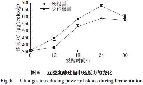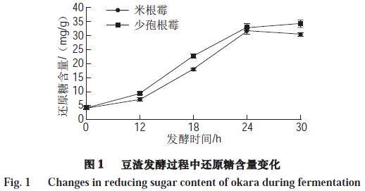 由圖1可知,豆渣中的還原糖隨著發(fā)酵時(shí)間的延長而增加,其中在12~24 h期間顯著增加(P<0.05),經(jīng)米根霉、少孢根霉發(fā)酵30 h后豆渣還原糖含量分別為30.47、34.28 mg/g,比未發(fā)酵豆渣分別提高了7.31、8.22 倍。由于在發(fā)酵過程中微生物所分泌的纖維素酶及淀粉酶的作用,可將豆渣中的纖維素、淀粉等降解為低分子的還原糖,從而使豆渣中還原糖的含量隨著發(fā)酵時(shí)間的延長而增加。