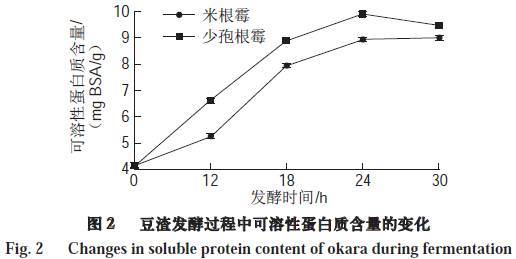 由圖2可知,隨著發(fā)酵時(shí)間的延長,豆渣的可溶性蛋白質(zhì)含量在0~24 h顯著增加(P<0.5),之后稍有下降。少孢根霉發(fā)酵豆渣的可溶性蛋白質(zhì)含量由發(fā)酵前的4.17 mg BSA /g增加至9.44 mg BSA /g,米根霉發(fā)酵豆渣的略低于同時(shí)間內(nèi)少孢根霉發(fā)酵豆渣,為8.99 mg BSA/g。由于在微生物的發(fā)酵過程中,豆渣中的蛋白質(zhì)被分解成多肽和一些有一定空間結(jié)構(gòu)但分子質(zhì)量較小的蛋白質(zhì),增加了其蛋白質(zhì)的溶解性,所以可溶性蛋白質(zhì)的含量會(huì)增加。Sun Hong等采用枯草芽孢桿菌對(duì)棉籽粉進(jìn)行發(fā)酵,也發(fā)現(xiàn)發(fā)酵后的棉籽粉中可溶性蛋白質(zhì)增多。進(jìn)一步延長發(fā)酵時(shí)間,豆渣中的蛋白質(zhì)更多的被降解成氨基酸和分子質(zhì)量更小的小肽物質(zhì),而考馬斯亮藍(lán)法更多是反映大分子可溶性蛋白質(zhì)變化的情況,無法準(zhǔn)確測定其中的氨基酸和小肽,從而造成后期可溶性蛋白質(zhì)呈現(xiàn)下降趨勢。