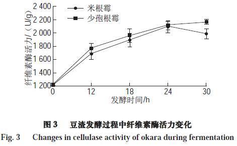 由圖3可知,發(fā)酵后的豆渣中纖維素酶活力較未發(fā)酵的豆渣有顯著提高(P<0.05)。發(fā)酵30 h后,經(jīng)米根霉、少孢根霉發(fā)酵的豆渣中纖維素酶活力分別達(dá)到1 989.42、2 165.73 U/g,比未發(fā)酵豆渣分別提高了1.62、1.77 倍。纖維素酶活力的變化影響豆渣中膳食纖維的含量。微生物在發(fā)酵過程中所產(chǎn)生的纖維素酶將水不溶性膳食纖維多糖水解,從而使水溶性膳食纖維多糖成分增加。另一方面水不溶性膳食纖維的大大減少導(dǎo)致總膳食纖維含量的降低。霉菌發(fā)酵可適當(dāng)提高豆渣可溶性膳食纖維含量,使得豆渣的抗氧化、抗血壓等功能活性提高。