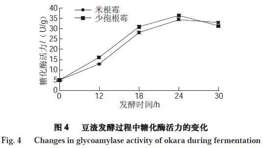 由圖4可知,未發(fā)酵豆渣中糖化酶活力較低,僅為4.90 U/g,經(jīng)米根霉、少孢根霉發(fā)酵后,其糖化酶活力與未發(fā)酵的豆渣相比得到顯著提高(P<0.05)。米根霉、少孢根霉發(fā)酵的豆渣糖化酶活力均在發(fā)酵24 h達(dá)到最大,最高值分別為34.25、36.09 U/g。微生物可以在發(fā)酵過程中分泌產(chǎn)生糖化酶,將豆渣中的碳水化合物糖化,進(jìn)而提高微生物生長所需要的碳源。繼續(xù)培養(yǎng),糖化酶活力均稍有下降,此時(shí)霉菌生長已經(jīng)處于停滯期,抑制糖化酶活力,從而導(dǎo)致酶活力下降。糖化酶活力的變化與還原糖變化規(guī)律基本一致。
