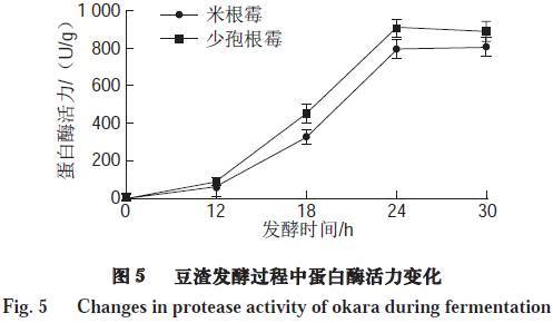 由圖5可知,豆渣在初始發(fā)酵的12 h內(nèi),蛋白酶活力變化不明顯,可能是因?yàn)樵?~12 h霉菌孢子處于萌發(fā)狀態(tài)。12 h后,隨著發(fā)酵時(shí)間的延長,微生物生長迅速,代謝也逐漸旺盛,蛋白酶活力不斷提高。在24 h經(jīng)米根霉、少孢根霉發(fā)酵的豆渣中蛋白酶活力分別達(dá)到796.68、906.47 U/g。但是,隨著發(fā)酵時(shí)間的進(jìn)一步延長,微生物分解蛋白質(zhì)的能力減弱,從而導(dǎo)致蛋白酶活力變化趨于穩(wěn)定。微生物在發(fā)酵過程中所產(chǎn)生的蛋白酶會(huì)使得豆渣中的功能性小肽和氨基酸得到部分積累,從而改善豆渣的功能活性。
