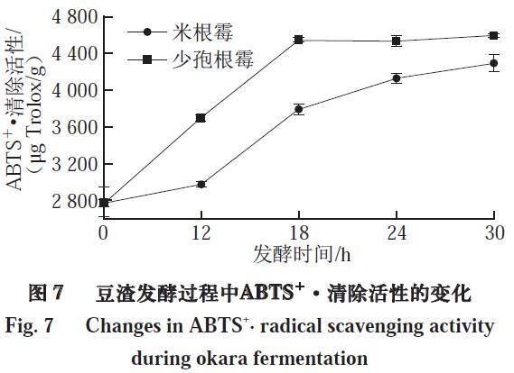 如圖7所示,米根霉、少孢根霉在發(fā)酵0~18 h時(shí),豆渣的ABTS·清除活性均隨著發(fā)酵時(shí)間的延長顯著上升,在18 h分別達(dá)到3 803.34、4 546.31 μg Trolox/g,相比于未發(fā)酵的豆渣分別提高了1.36、1.63 倍。少孢根霉發(fā)酵豆渣的ABTS·清除活性在18 h后趨于穩(wěn)定,而米根霉發(fā)酵豆渣的在18 h后隨著發(fā)酵時(shí)間的延長仍有小幅度提高。在30 h時(shí),其ABTS·清除活性為4 298.66 μg Trolox/g。ABTS·清除能力的不同表明發(fā)酵產(chǎn)物的抗氧化性與其抗氧化物的種類和含量有關(guān)。不同微生物有不同的發(fā)酵特性,因此在發(fā)酵過程中,發(fā)酵產(chǎn)物的種類、比例以及含量都會(huì)隨著發(fā)酵時(shí)間的進(jìn)行而變化,因此捕獲自由基的能力可能有變化。