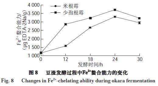 如圖8所示,米根霉和少孢根霉發(fā)酵24 h后其水提取物對(duì)于Fe2+螯合能力比未發(fā)酵豆渣有明顯提高,螯合能力分別為3 296.88、3 709.16 μg EDTA-2Na/g,此后隨著發(fā)酵時(shí)間的延長稍有降低。已有報(bào)道顯示許多傳統(tǒng)發(fā)酵食品,如koji、kinema在發(fā)酵后均能提高其對(duì)金屬離子的螯合能力。Pownall等指出一些功能性小肽由于其特殊的肽鏈結(jié)構(gòu)及側(cè)鏈氨基酸,可以阻斷自由基的鏈?zhǔn)椒磻?yīng),對(duì)于螯合過渡態(tài)的金屬離子起著重要的作用。