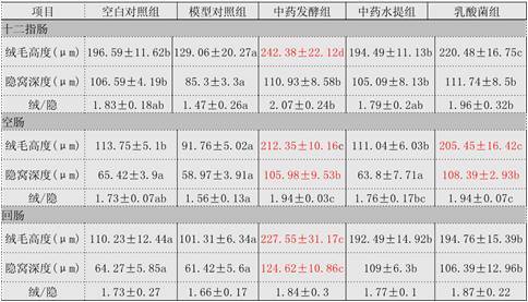 模型對照組十二指腸、回腸、空腸絨毛稀松,較短,具有大量脫離上皮細(xì)胞碎片??瞻讓φ战M因斷奶仔豬腸道發(fā)育不健全,也存在破損現(xiàn)象。中藥發(fā)酵組和乳酸菌組,十二指腸、空腸、回腸絨毛排列緊密,較長,結(jié)構(gòu)完整,無脫落和破損現(xiàn)象。