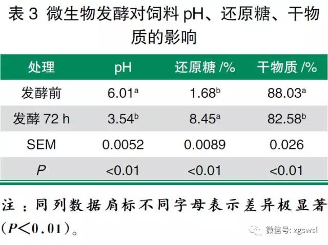 從表3 和圖5 中可以看出,發(fā)酵過程中飼料的干物質(zhì)含量逐漸降低,在72 h 后顯著降低6.2%(P <0.01,圖6)綜上所述,配合飼料經(jīng)過微生物發(fā)酵,增加有機酸含量,降低飼料pH,降低干物質(zhì),增加飼料還原糖。