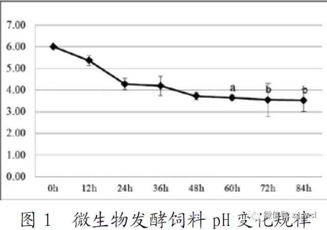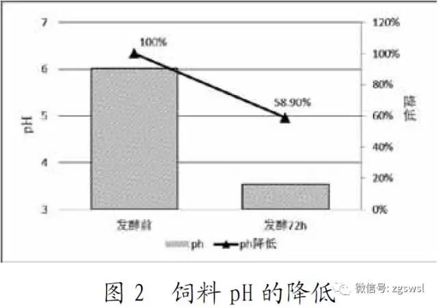 接種乳酸菌、酵母菌和枯草芽孢桿菌發(fā)酵全價料,飼料的pH 變化規(guī)律如圖1 所示,可以看出,飼料pH 逐漸降低,隨著發(fā)酵的進行漸緩,并且在發(fā)酵72 h后pH 的降低差異不顯著(P >0.05)。由表3 分析可知,微生物發(fā)酵72 h后,飼料pH 顯著降低(P <0.01),降低了約41.1%(圖2)。