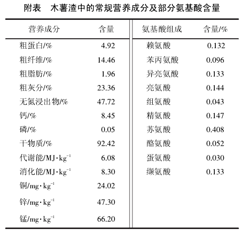 木薯經(jīng)過加工生產(chǎn)成為淀粉和酒精后所剩下來的下腳料混合物稱為木薯渣。木薯渣粗纖維含量高,碳水化合物含量高,微量元素、礦物質(zhì)和氨基酸含量豐富,但蛋白質(zhì)含量低,是一種來源廣泛、價格低廉的能量飼料。胡忠澤等采用常規(guī)分析和原子吸收分光光度計等現(xiàn)代化先進儀器相結(jié)合,對木薯渣的營養(yǎng)價值進行分析,分析結(jié)果見附表。吳世林等對木薯渣中部分氨基酸成分(以干物質(zhì)為基礎(chǔ))進行分析,結(jié)果見附表。