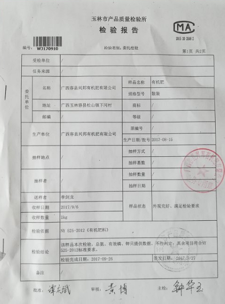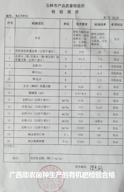 下面的有機(jī)肥的檢測報(bào)告是廣西助農(nóng)畜牧科技有限公司的一個(gè)客戶檢測報(bào)告與我公司送檢的液態(tài)有機(jī)肥檢測報(bào)告,證明特別是重金屬等都是合格的(液態(tài)狀態(tài)是不能進(jìn)行有機(jī)肥項(xiàng)目的檢測,需要在干糞的狀態(tài)下送檢,具體咨詢當(dāng)?shù)氐臋z測機(jī)構(gòu))。并符合NYT2596-2014 沼肥沼肥標(biāo)準(zhǔn)。