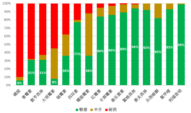金黃色葡萄球菌是子宮炎等多種炎癥的病原之一,其耐藥性產(chǎn)生快,對藥物效果的影響較大。2000的調(diào)查表明(見圖1),金葡菌對臨床應用時間較長的抗菌藥如青霉素、鏈霉素、磺胺藥物等耐藥較為普遍,對大環(huán)內(nèi)酯類、頭孢類較為敏感,利福昔明對金葡菌非常敏感,幾乎沒有耐藥。