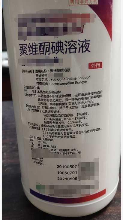 以聚維酮碘計(jì)。 皮膚消毒及治療皮膚病,5%溶液;奶牛乳頭浸泡,0.5%-1%溶液;黏膜及創(chuàng)面沖洗,0.1%溶液