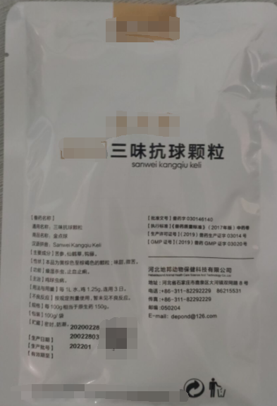 三味抗球顆粒,燥濕殺蟲,止血止痢,雞球蟲,每1l水,雞1.25克,連用3日