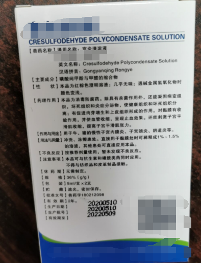 宮炎清溶液,用于牛,豬的慢性子宮內(nèi)膜炎,子宮頸炎,陰道炎等沖洗涂擦患處