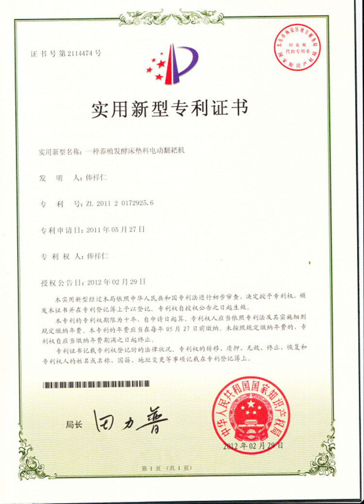 1. 《一種養(yǎng)殖發(fā)酵床墊料電動翻耙機》專利號:ZL201120172925.6