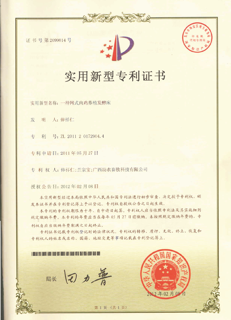 5.《一種網(wǎng)式肉雞養(yǎng)殖發(fā)酵床》專利號:ZL201120172904.4;