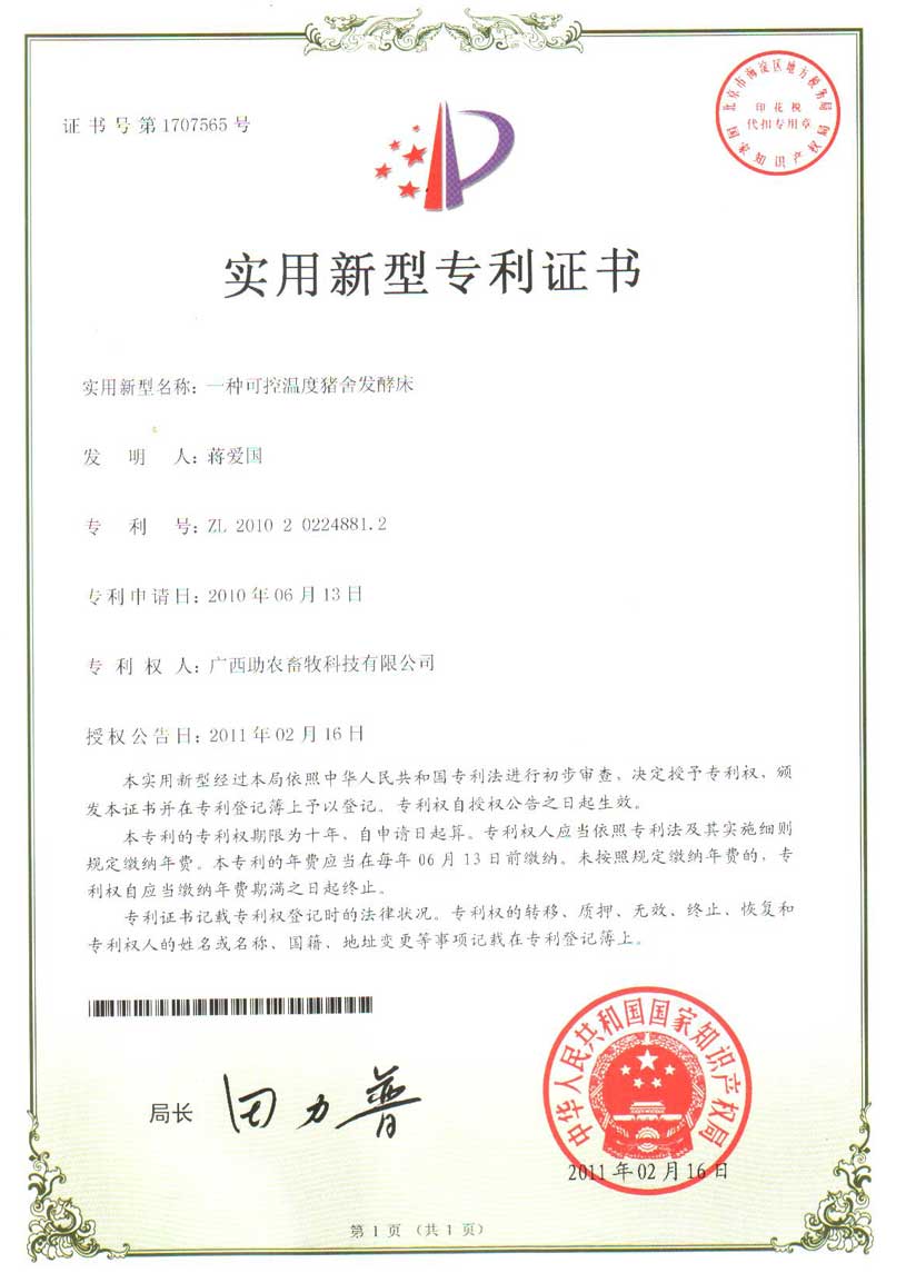 針對發(fā)酵床技術(shù)我公司與廣西助農(nóng)畜牧科技有限公司的8項實用新型技術(shù)發(fā)明專利: