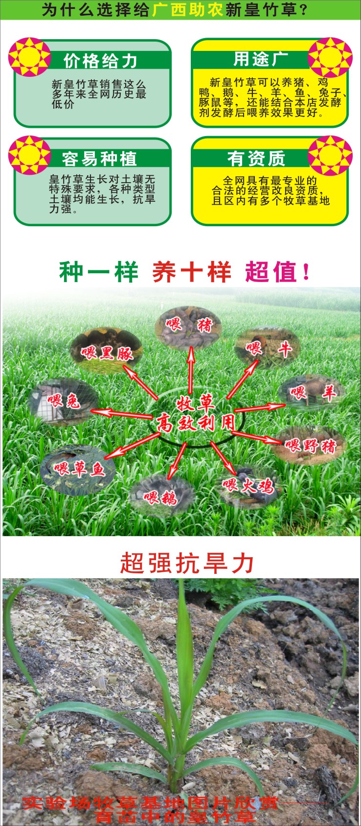 從2017年6月開始,由于糖蔗2號牧草各種參數(shù)都高于糖蔗1號牧草和蜜蔗1號牧草,我們將停止推廣糖蔗1號牧草和蜜蔗1號牧草。禾本科類的牧草我們只推廣糖蔗2號牧草、新型皇竹草、臺灣甜象草。特此聲明。
