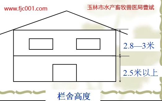 養(yǎng)殖欄舍高度  底層高度 2.5米以上,上層高度2.8-3米;下層門(mén)口及通道寬度2.5米以上,上層通道寬度1.2米以上。