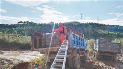 賀州市信都鎮(zhèn)祉洞林場(chǎng),非法傾倒事件發(fā)生后,消防人員協(xié)助環(huán)境監(jiān)察總隊(duì)對(duì)危險(xiǎn)廢物采樣。自治區(qū)環(huán)境監(jiān)察總隊(duì)供圖
