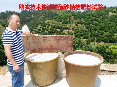 助農(nóng)公司的另外一個小組受邀桂林市水產(chǎn)畜牧獸醫(yī)局領(lǐng)導(dǎo)的要求,還對發(fā)酵水肥用于砂糖桔的工作進行了服務(wù),過去漚堆水肥需要3個月以上,我們的技術(shù)只需要7天左右就可以了,而且不臭,效果更牛,看到了巨大的另外一個商機。