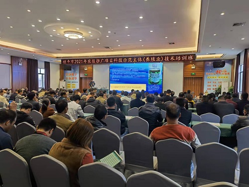 桂平市2021年農(nóng)技推廣項目科技示范主體(養(yǎng)殖業(yè))技術(shù)推廣培訓(xùn)班在西山假日大酒店開班,廣西助農(nóng)公司總經(jīng)理蔣愛國老師受邀對近170名養(yǎng)殖科技示范戶們授課