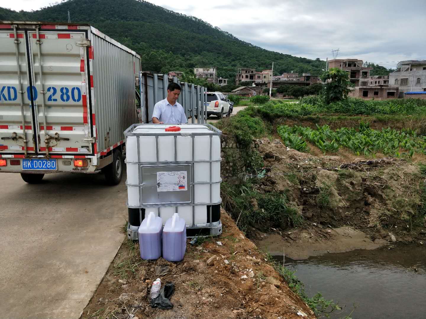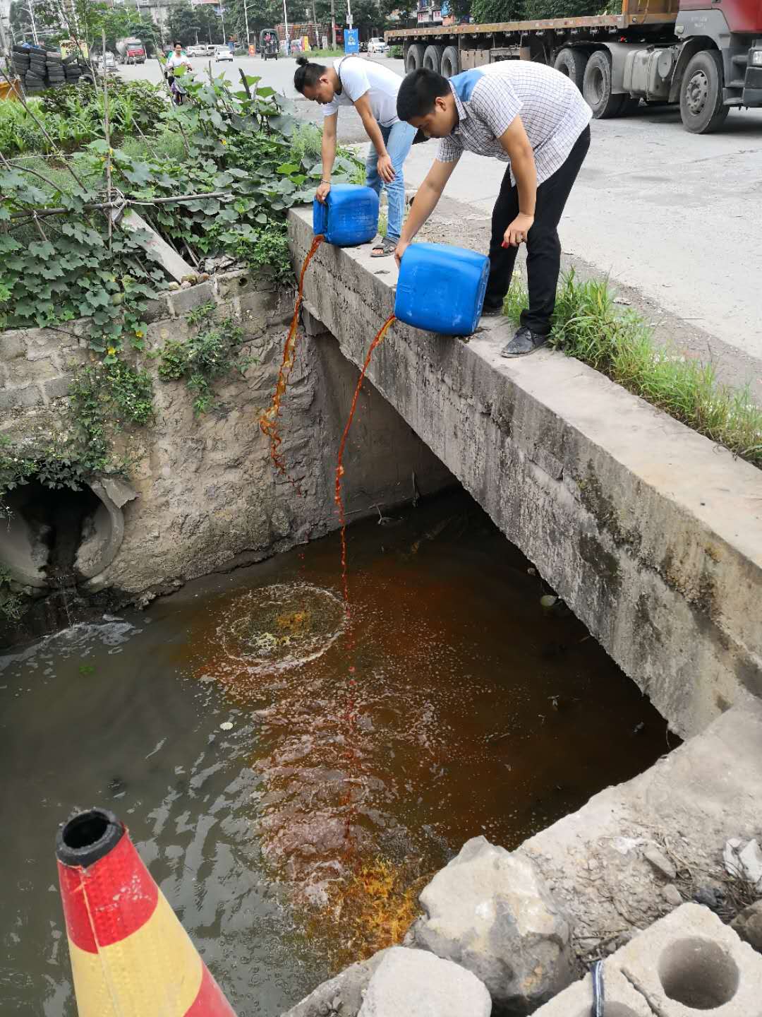 圖1、圖2    助農(nóng)公司人員正在用益生菌處理河道污水
