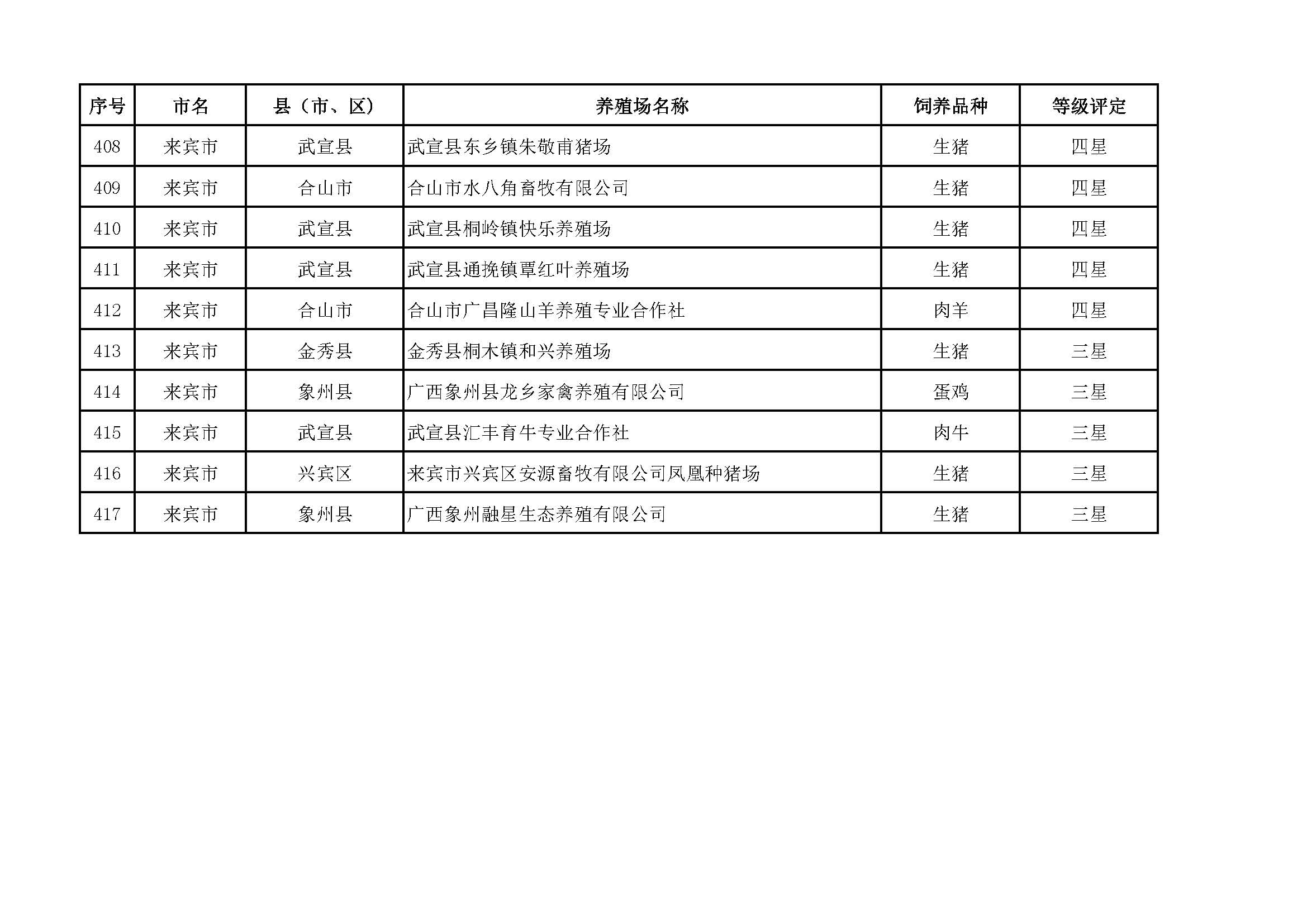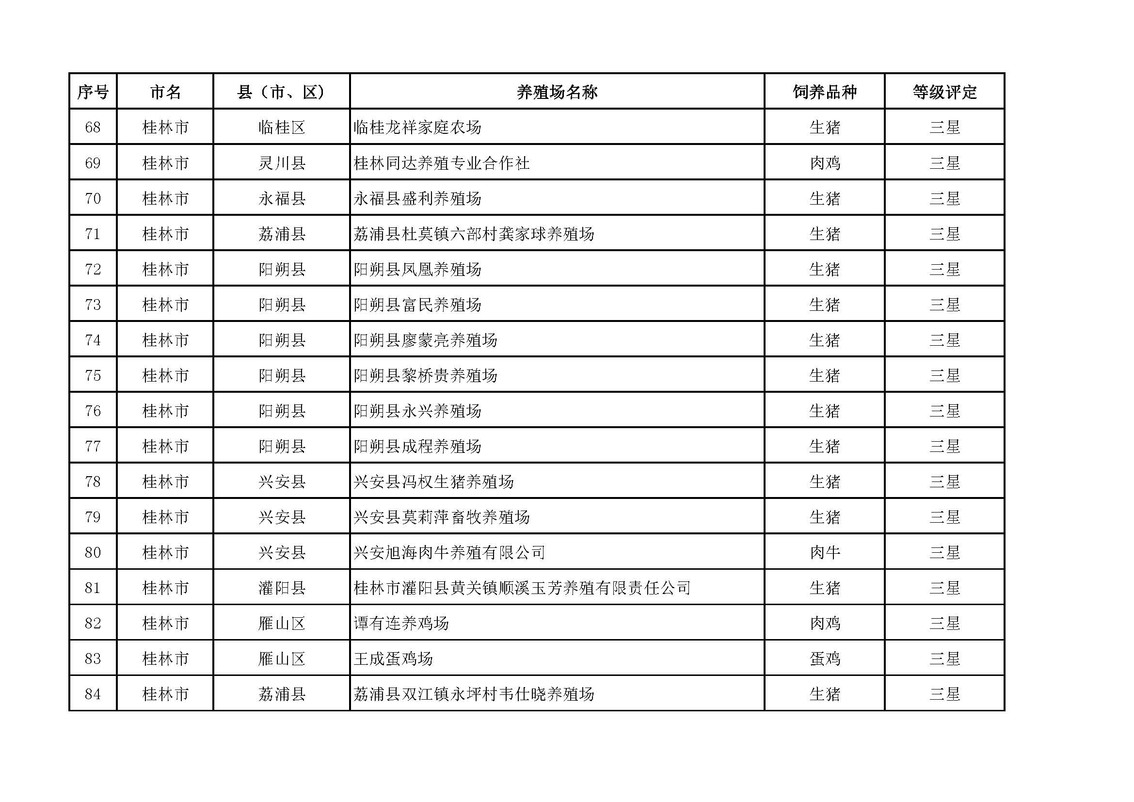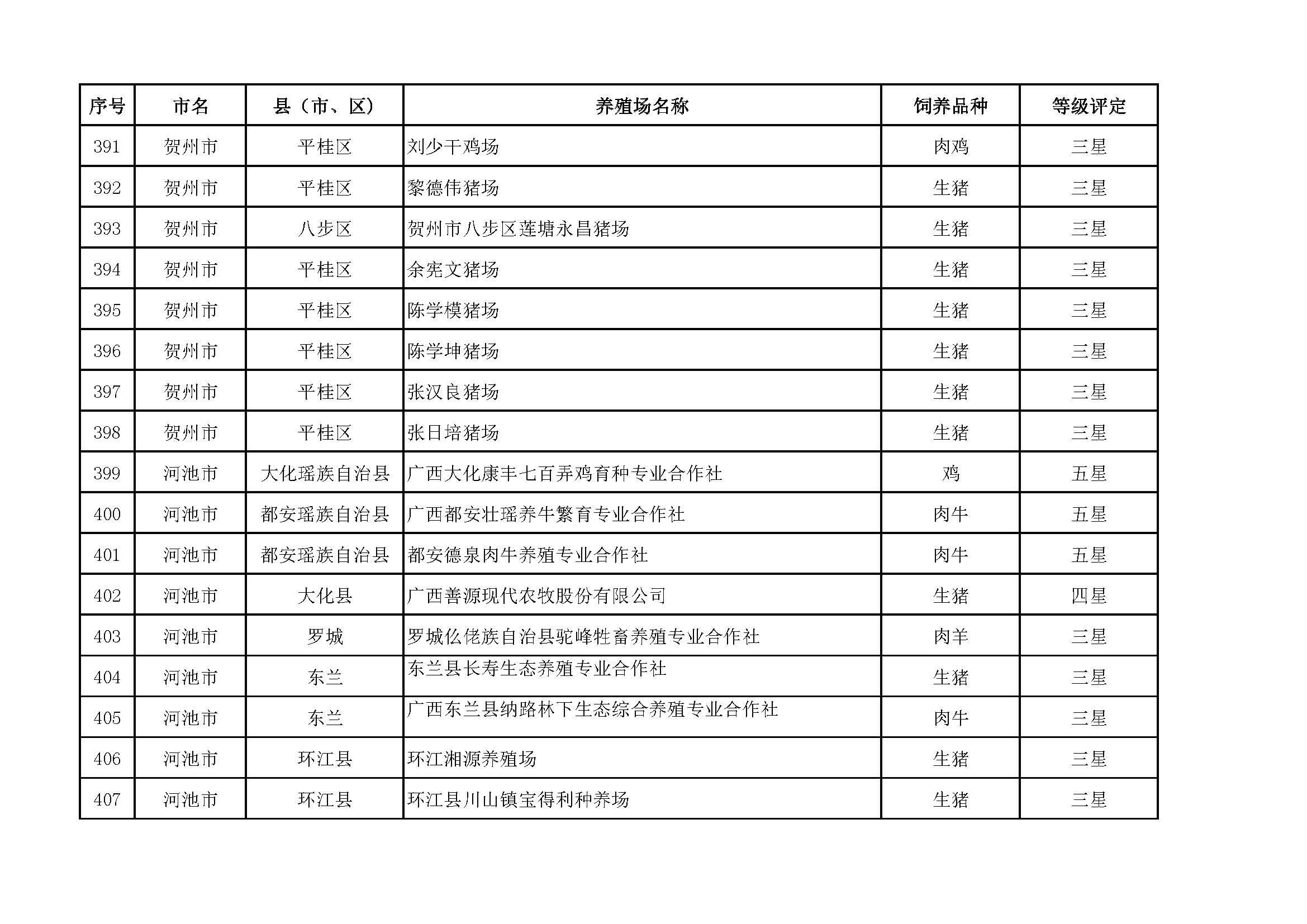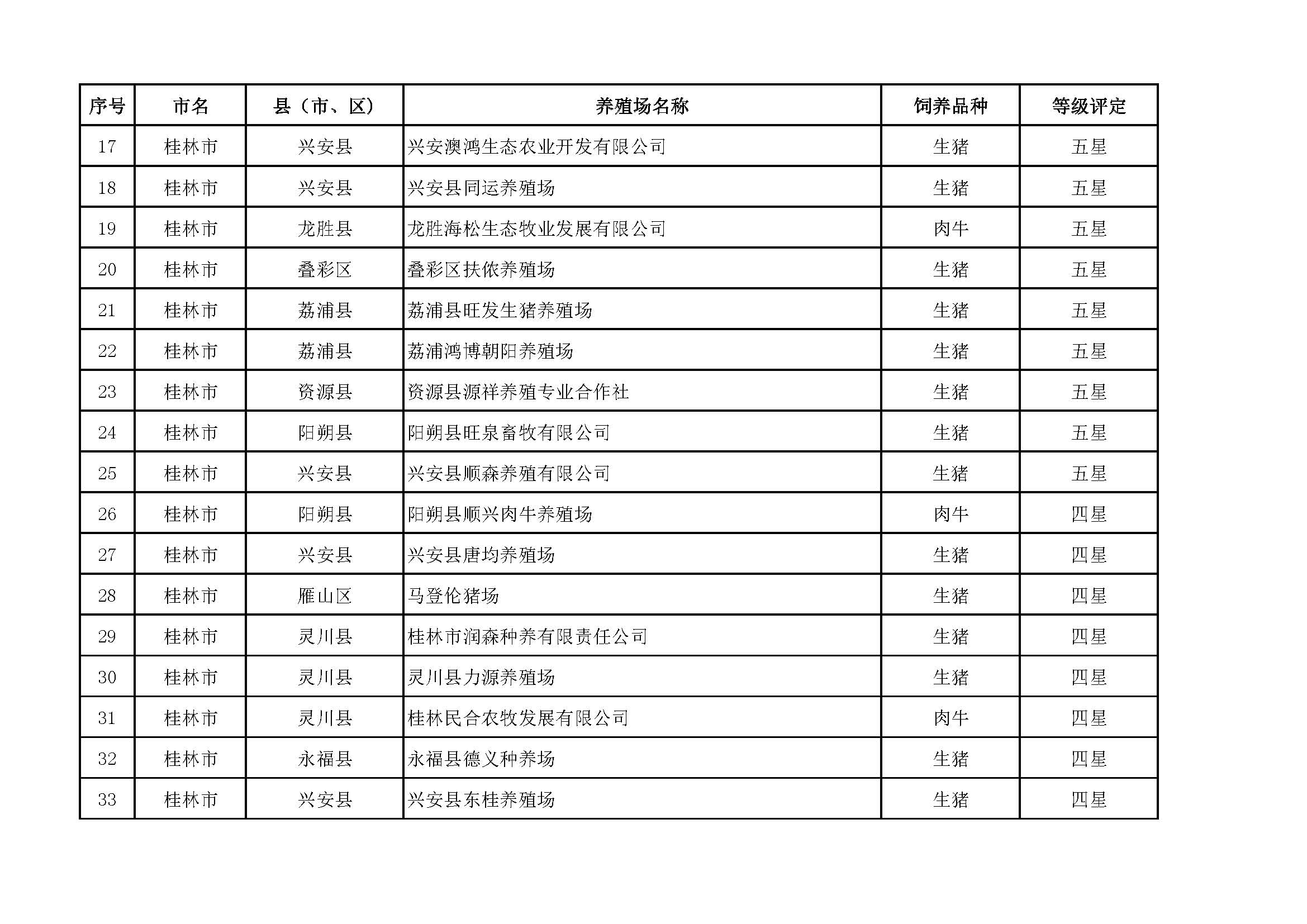 根據(jù)《廣西畜禽現(xiàn)代生態(tài)養(yǎng)殖場(chǎng)認(rèn)證工作方案(2017-2020)》(桂漁牧發(fā)〔2017〕16號(hào))精神,我局采取、市、自治區(qū)三級(jí)專家核驗(yàn)的方式組織開(kāi)展了2017年第一批廣西畜禽現(xiàn)代生態(tài)養(yǎng)殖場(chǎng)認(rèn)證工作。經(jīng)現(xiàn)場(chǎng)核驗(yàn)、網(wǎng)上公示,決定授予橫縣佛子畜牧有限公司等417家養(yǎng)殖場(chǎng)“廣西畜禽現(xiàn)代生態(tài)養(yǎng)殖場(chǎng)”稱號(hào),其中五星級(jí)58家、四星級(jí)136家、三星級(jí)223家,現(xiàn)將名單予以公布。有效期5年(自發(fā)文之日起至2021年12月31日止)。獲得 “四星級(jí)”或“三星級(jí)”稱號(hào)的養(yǎng)殖場(chǎng),經(jīng)過(guò)整改提高,自評(píng)達(dá)到上一星級(jí)標(biāo)準(zhǔn)的,可以按程序申請(qǐng)升級(jí)。
