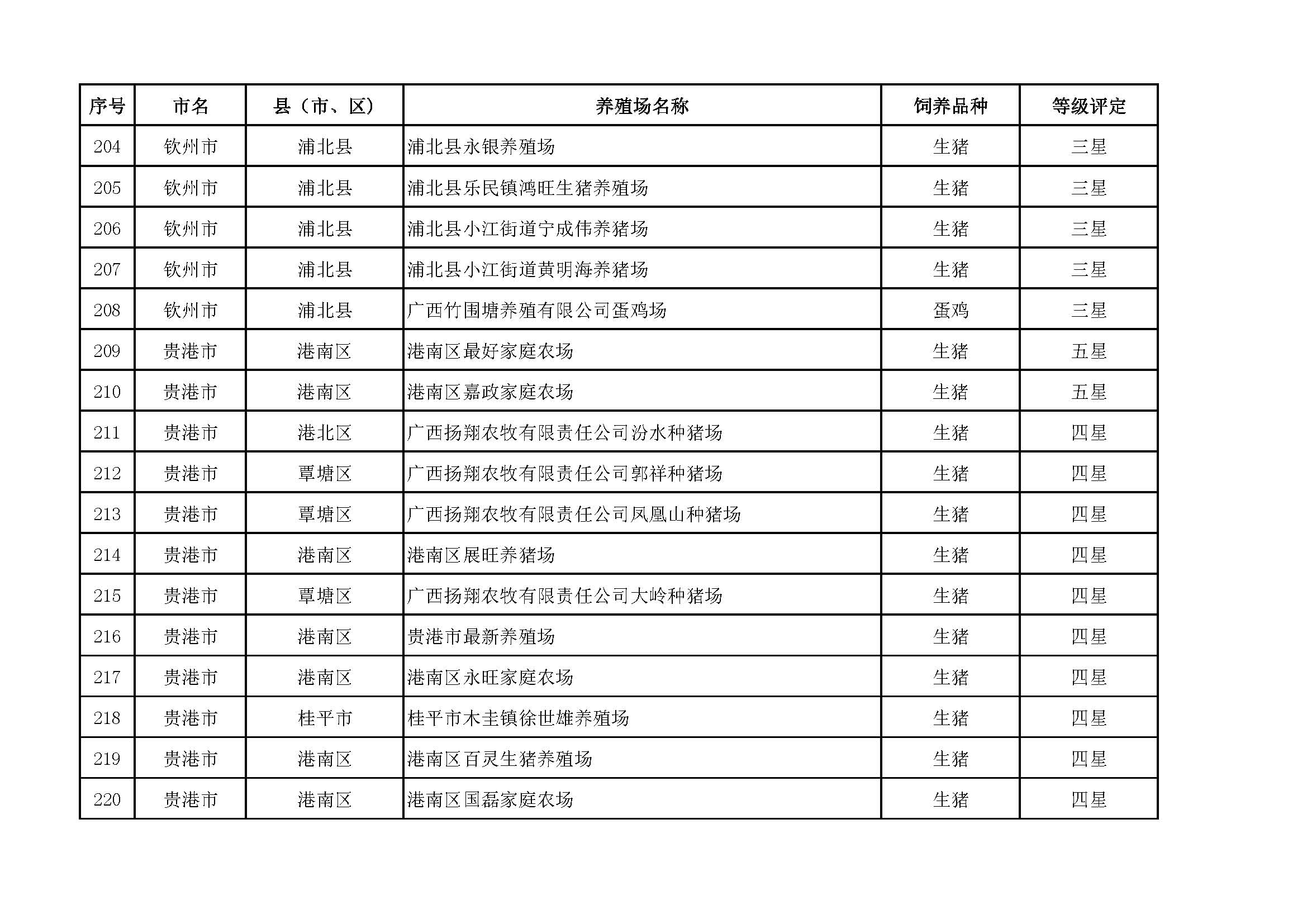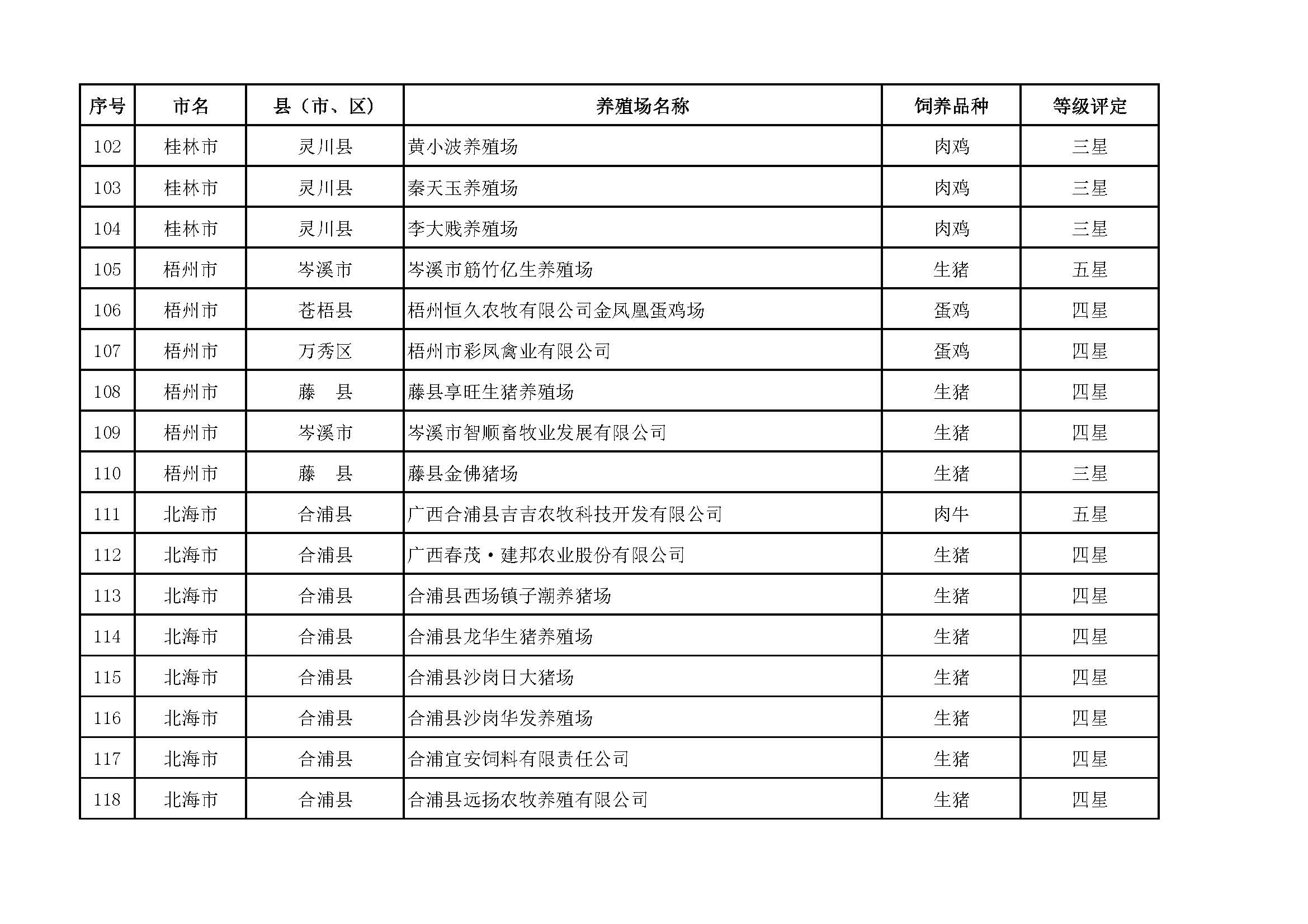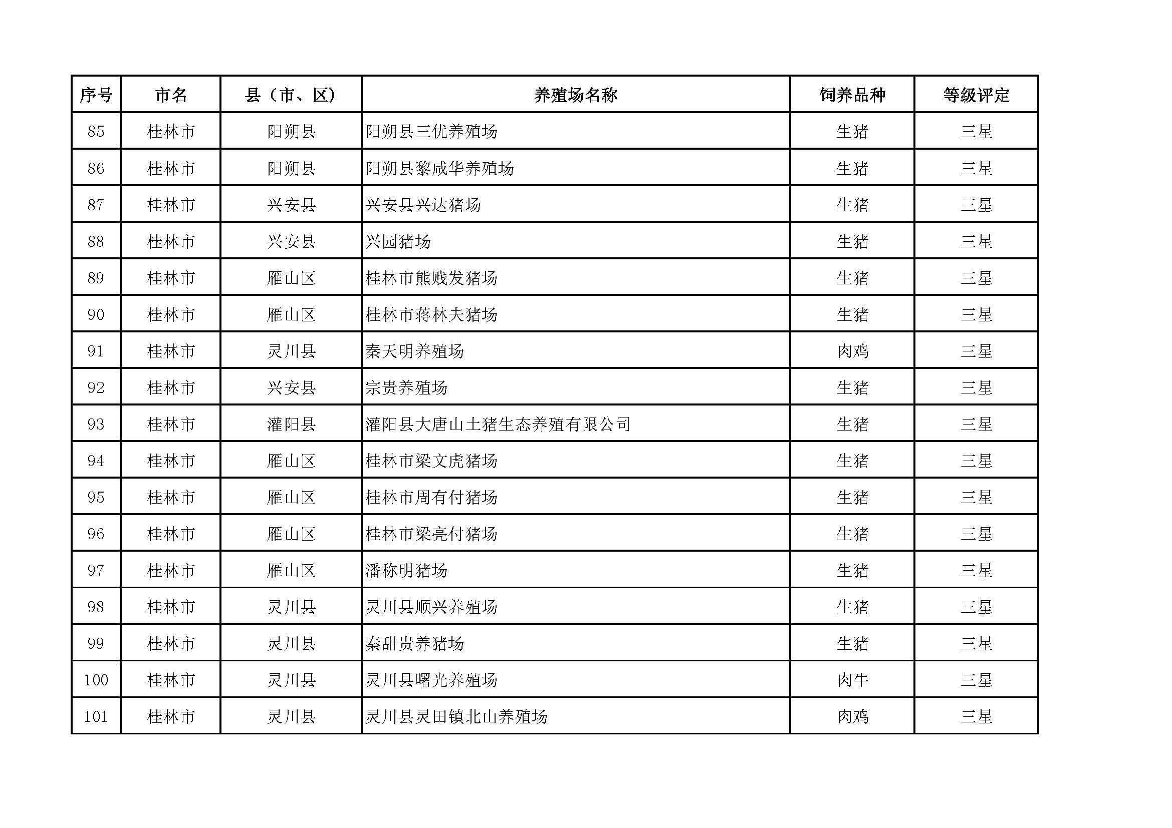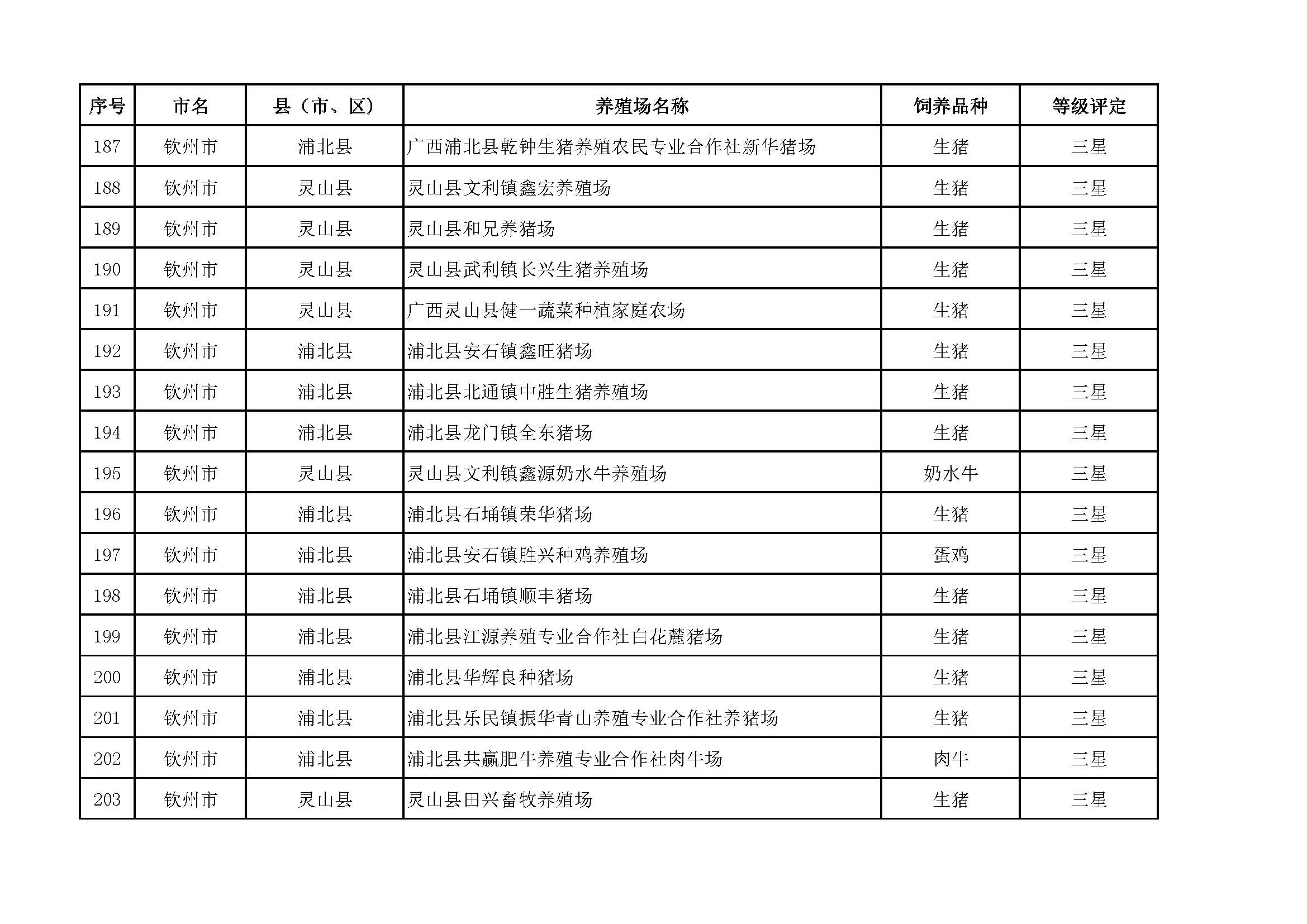 根據(jù)《廣西畜禽現(xiàn)代生態(tài)養(yǎng)殖場(chǎng)認(rèn)證工作方案(2017-2020)》(桂漁牧發(fā)〔2017〕16號(hào))精神,我局采取、市、自治區(qū)三級(jí)專家核驗(yàn)的方式組織開(kāi)展了2017年第一批廣西畜禽現(xiàn)代生態(tài)養(yǎng)殖場(chǎng)認(rèn)證工作。經(jīng)現(xiàn)場(chǎng)核驗(yàn)、網(wǎng)上公示,決定授予橫縣佛子畜牧有限公司等417家養(yǎng)殖場(chǎng)“廣西畜禽現(xiàn)代生態(tài)養(yǎng)殖場(chǎng)”稱號(hào),其中五星級(jí)58家、四星級(jí)136家、三星級(jí)223家,現(xiàn)將名單予以公布。有效期5年(自發(fā)文之日起至2021年12月31日止)。獲得 “四星級(jí)”或“三星級(jí)”稱號(hào)的養(yǎng)殖場(chǎng),經(jīng)過(guò)整改提高,自評(píng)達(dá)到上一星級(jí)標(biāo)準(zhǔn)的,可以按程序申請(qǐng)升級(jí)。