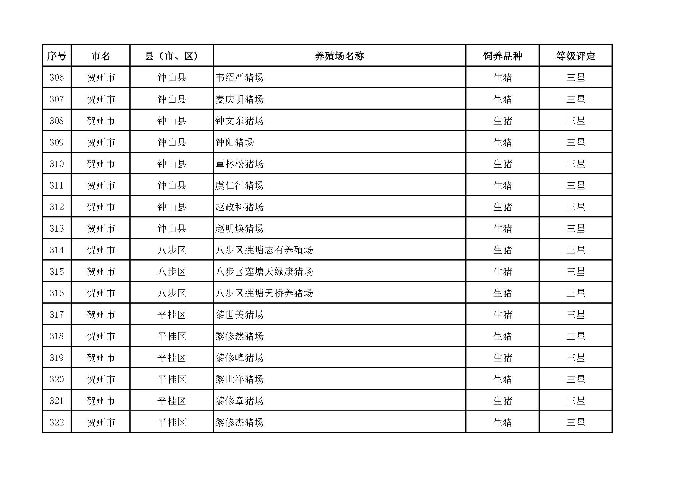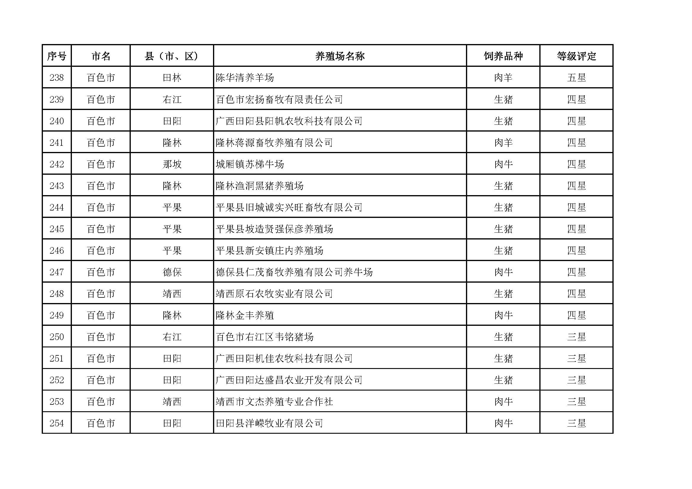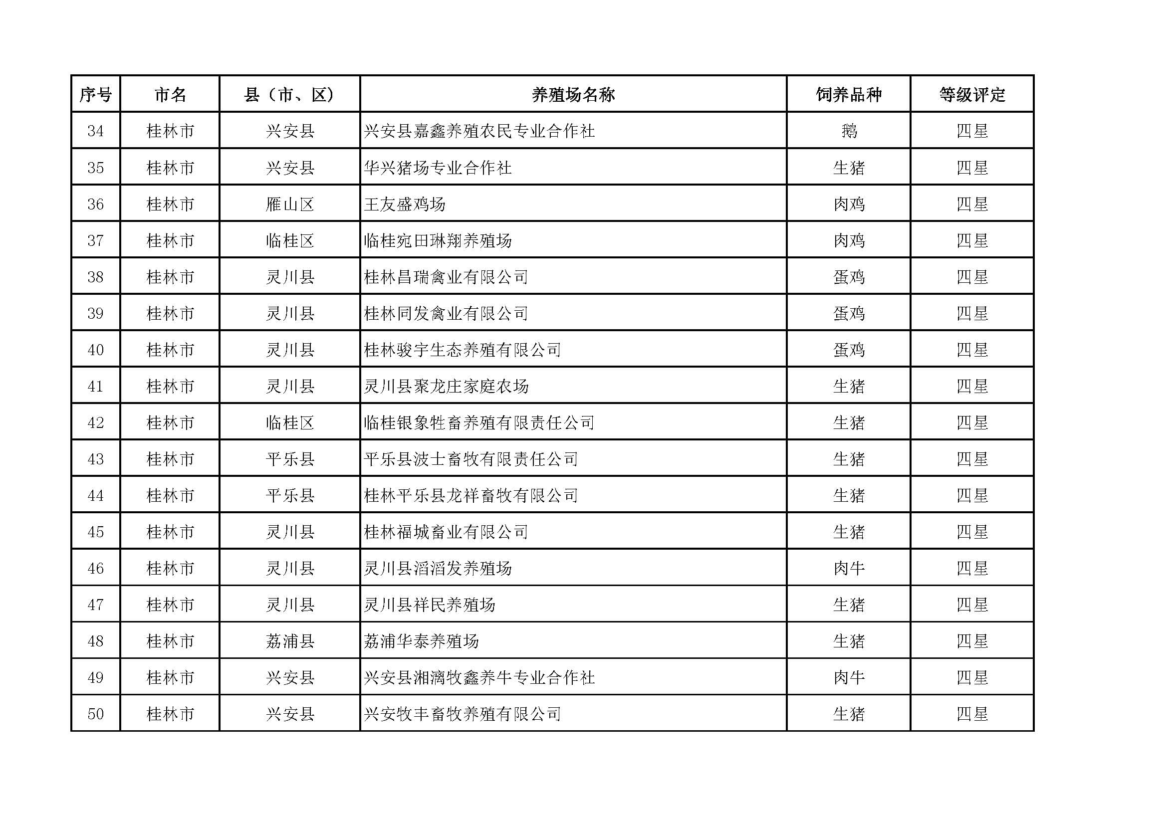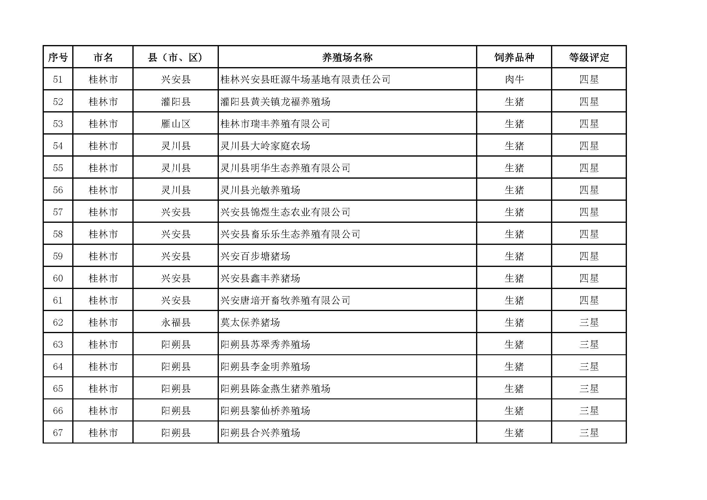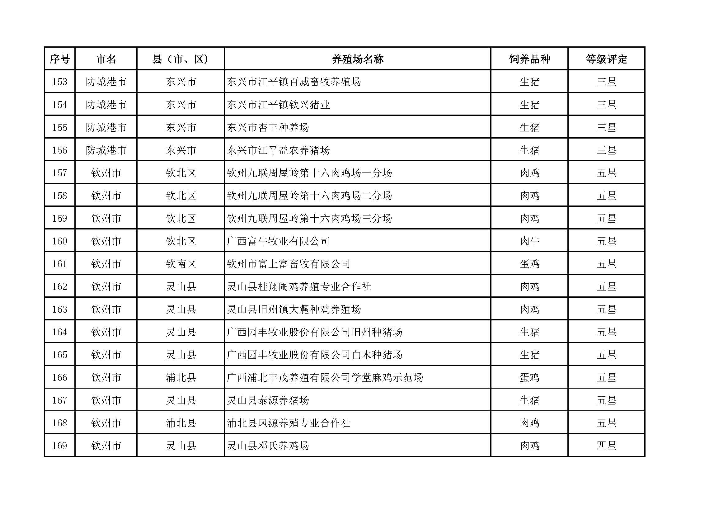 根據(jù)《廣西畜禽現(xiàn)代生態(tài)養(yǎng)殖場(chǎng)認(rèn)證工作方案(2017-2020)》(桂漁牧發(fā)〔2017〕16號(hào))精神,我局采取、市、自治區(qū)三級(jí)專家核驗(yàn)的方式組織開(kāi)展了2017年第一批廣西畜禽現(xiàn)代生態(tài)養(yǎng)殖場(chǎng)認(rèn)證工作。經(jīng)現(xiàn)場(chǎng)核驗(yàn)、網(wǎng)上公示,決定授予橫縣佛子畜牧有限公司等417家養(yǎng)殖場(chǎng)“廣西畜禽現(xiàn)代生態(tài)養(yǎng)殖場(chǎng)”稱號(hào),其中五星級(jí)58家、四星級(jí)136家、三星級(jí)223家,現(xiàn)將名單予以公布。有效期5年(自發(fā)文之日起至2021年12月31日止)。獲得 “四星級(jí)”或“三星級(jí)”稱號(hào)的養(yǎng)殖場(chǎng),經(jīng)過(guò)整改提高,自評(píng)達(dá)到上一星級(jí)標(biāo)準(zhǔn)的,可以按程序申請(qǐng)升級(jí)。