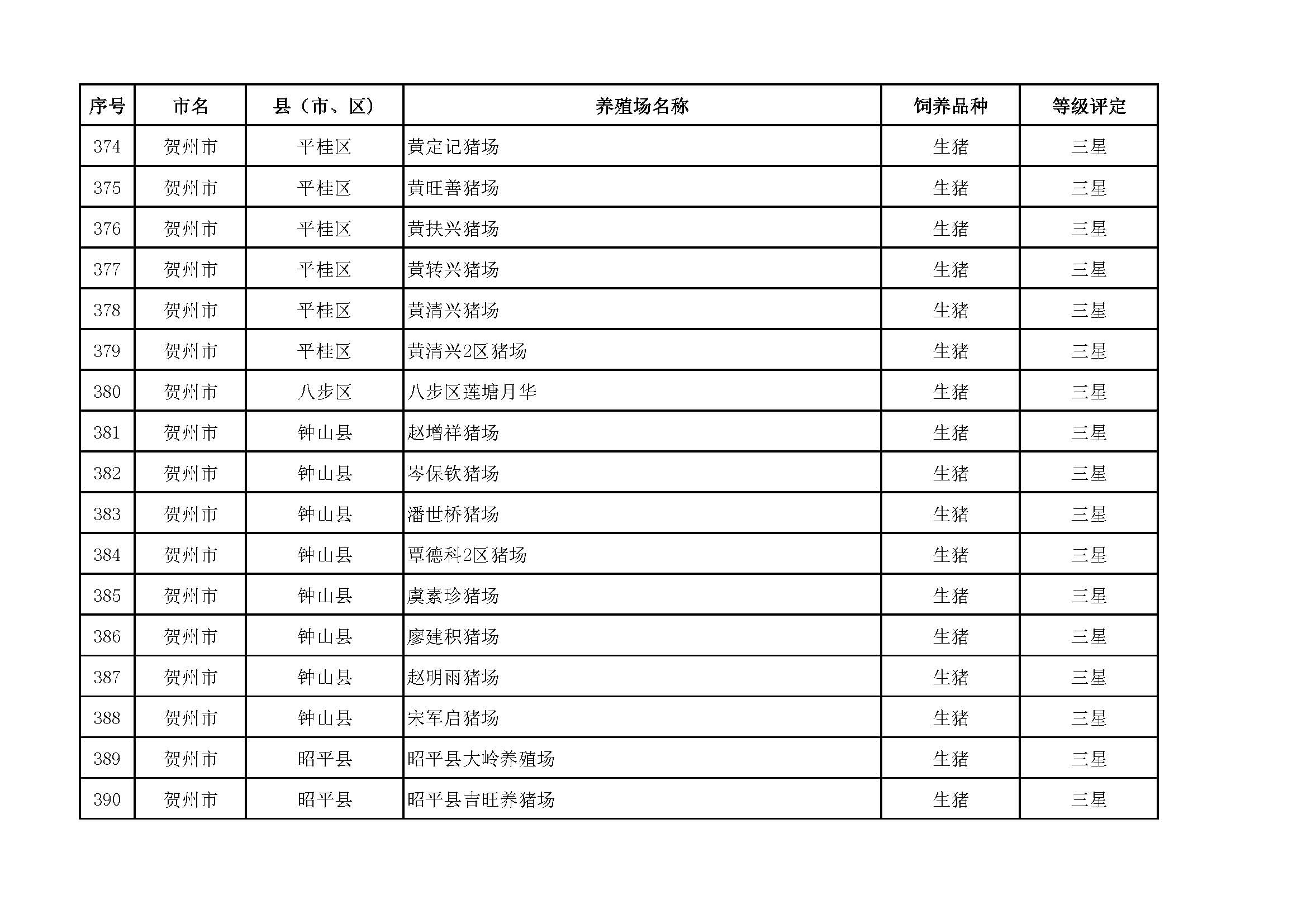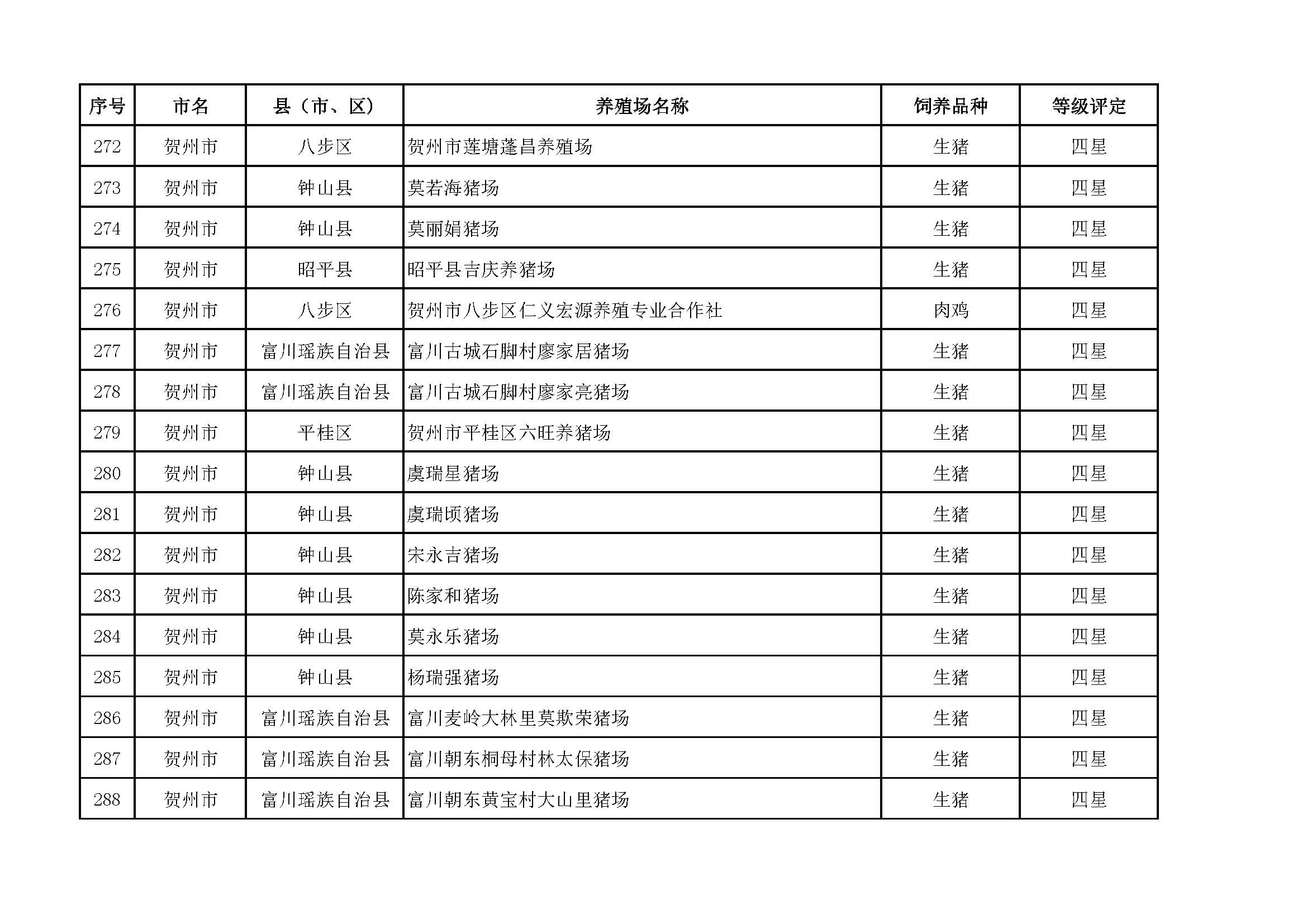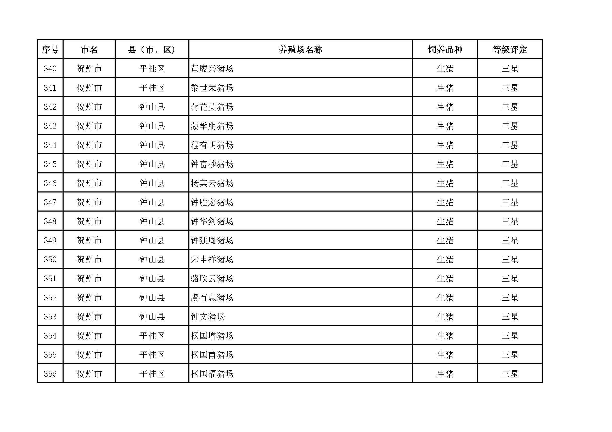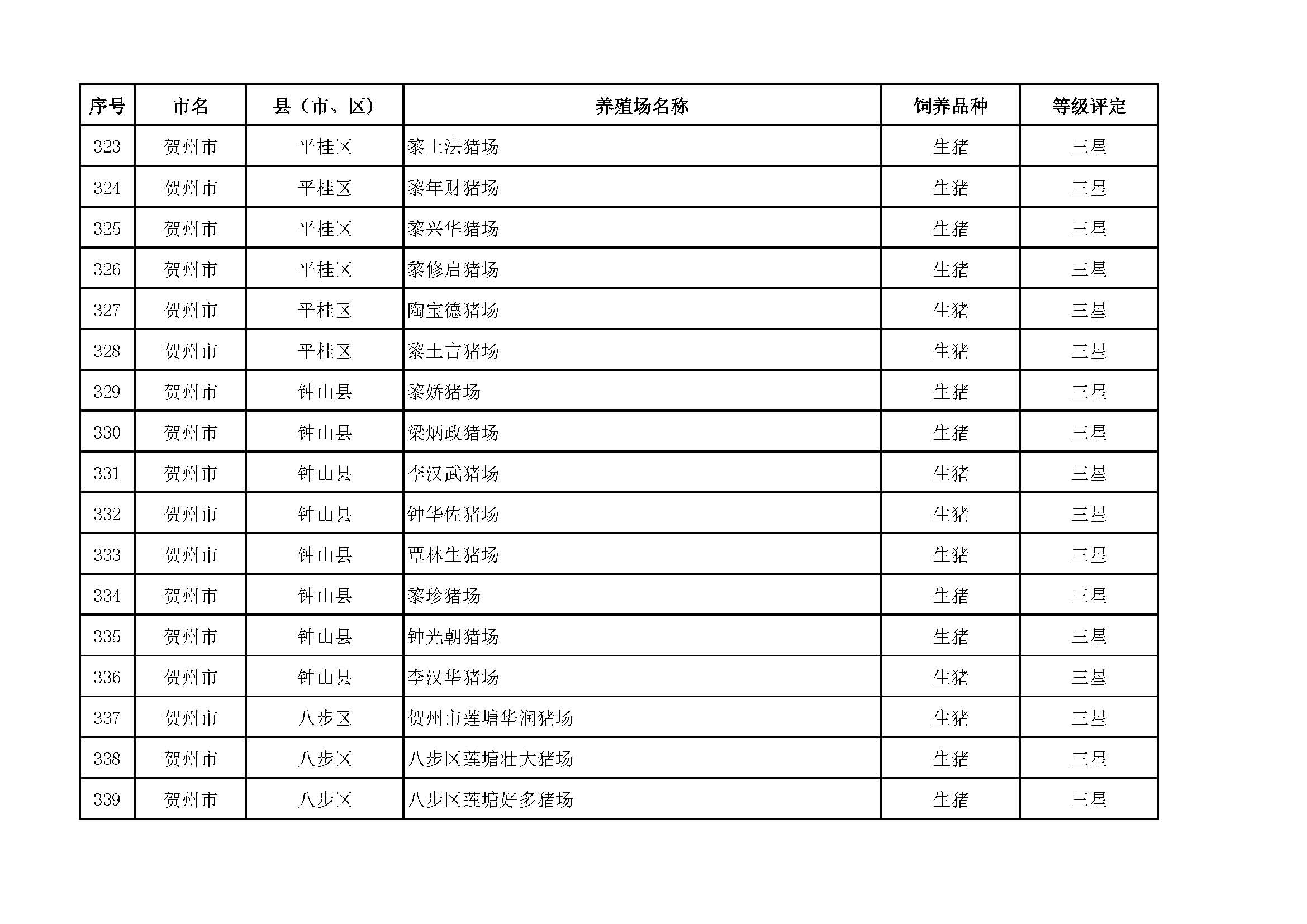 根據(jù)《廣西畜禽現(xiàn)代生態(tài)養(yǎng)殖場(chǎng)認(rèn)證工作方案(2017-2020)》(桂漁牧發(fā)〔2017〕16號(hào))精神,我局采取、市、自治區(qū)三級(jí)專家核驗(yàn)的方式組織開(kāi)展了2017年第一批廣西畜禽現(xiàn)代生態(tài)養(yǎng)殖場(chǎng)認(rèn)證工作。經(jīng)現(xiàn)場(chǎng)核驗(yàn)、網(wǎng)上公示,決定授予橫縣佛子畜牧有限公司等417家養(yǎng)殖場(chǎng)“廣西畜禽現(xiàn)代生態(tài)養(yǎng)殖場(chǎng)”稱號(hào),其中五星級(jí)58家、四星級(jí)136家、三星級(jí)223家,現(xiàn)將名單予以公布。有效期5年(自發(fā)文之日起至2021年12月31日止)。獲得 “四星級(jí)”或“三星級(jí)”稱號(hào)的養(yǎng)殖場(chǎng),經(jīng)過(guò)整改提高,自評(píng)達(dá)到上一星級(jí)標(biāo)準(zhǔn)的,可以按程序申請(qǐng)升級(jí)。