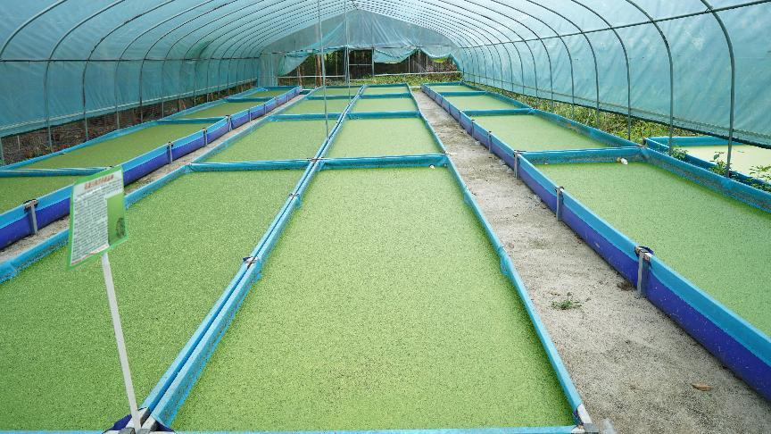 ??科技賦能不僅體現(xiàn)在七百弄雞的養(yǎng)殖環(huán)節(jié),更貫穿于整個(gè)產(chǎn)業(yè)鏈。“基地創(chuàng)新采用‘微生物+浮萍’雙效糞污處理系統(tǒng),將養(yǎng)殖廢水經(jīng)發(fā)酵后流入浮萍池,使浮萍吸收養(yǎng)分轉(zhuǎn)化為高蛋白飼料,同時(shí)實(shí)現(xiàn)水資源凈化循環(huán)利用?!备眻鲩L王綱杰說。
