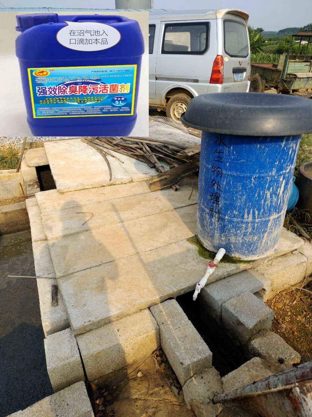 對原來老舊的污水全池潑灑強效除臭降污活菌劑,5天后再重復(fù)潑灑一次,并且在沼氣池的出入口滴入稀釋后的強效除臭降污活菌劑。10天左右一次直接抽走澆灌周邊的作物,達到無臭味不燒苗的要求。