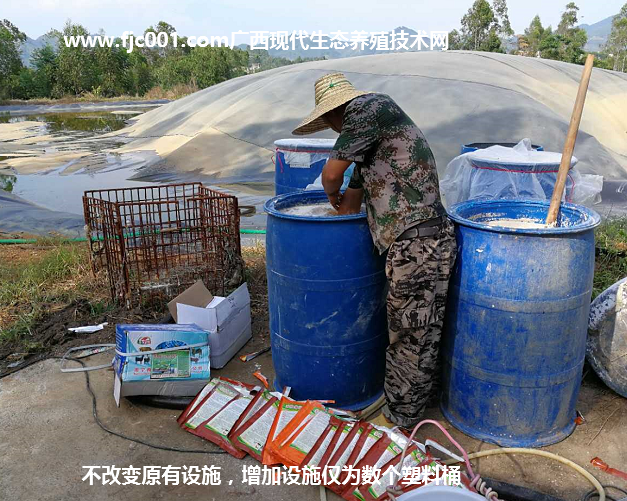 8月初,廣西助農(nóng)畜牧科技有限公司技術(shù)員小蔣應(yīng)急趕往岑溪龍母種豬場(chǎng)與李場(chǎng)長(zhǎng)親手操作污水處理劑激活液開(kāi)始對(duì)污水進(jìn)行處理?。ㄒ韵赂綀D為證)