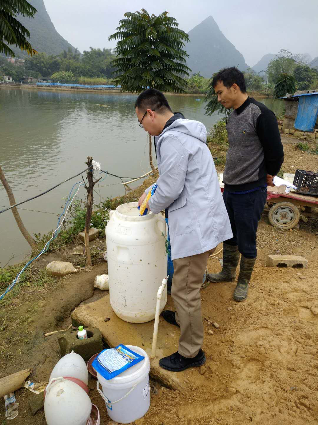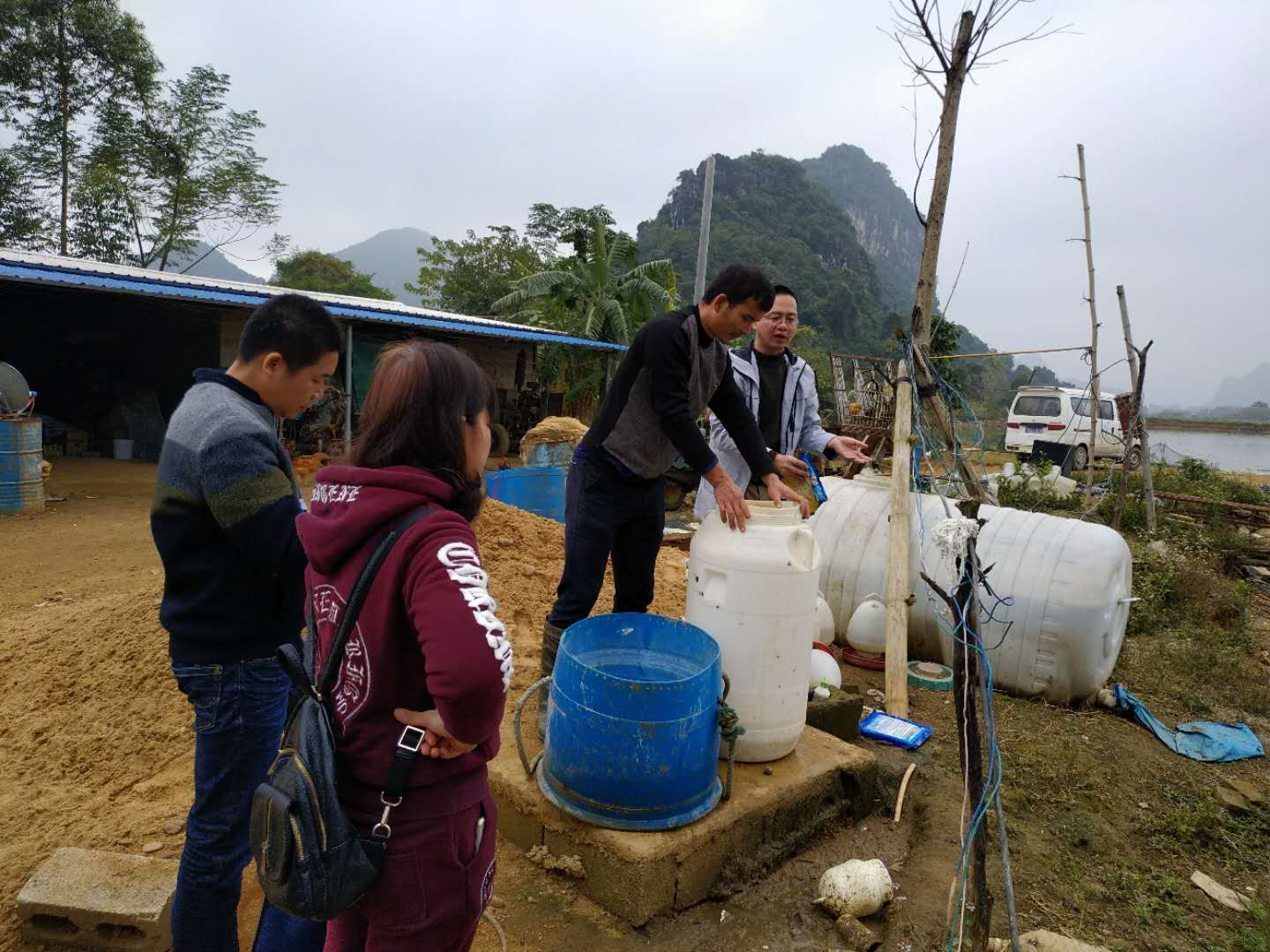 區(qū)畜牧推廣站工作人員和廣西助農公司技術員在進行指導