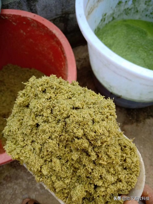 步驟一:將牧草、青綠秸稈通過(guò)機(jī)器粉碎。步驟二:2噸粉碎牧草與200公斤玉米粉、一包99多功能飼料發(fā)酵劑,4.5公斤食鹽混合壓實(shí)在塑料容器中密封發(fā)酵一周以上。