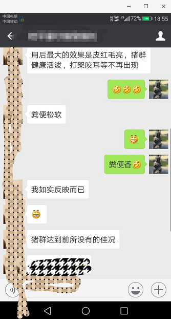 助農(nóng)技術(shù)員針對(duì)該養(yǎng)殖場(chǎng)存在的問題一一進(jìn)行指導(dǎo),黃老板半信半疑,但是還是當(dāng)場(chǎng)訂貨試用。半個(gè)月后,黃老板主動(dòng)電話聯(lián)系技術(shù)員,他說(shuō)產(chǎn)品效果非常好,他在飼料中全部使用養(yǎng)豬專用復(fù)合益生菌,消毒使用高效持久生物除臭消毒劑,豬舍內(nèi)氨氣味大大減少,喘氣咳嗽現(xiàn)象幾乎沒有了,最主要的是豬群皮紅毛亮,健康活潑,打架咬耳等不再出現(xiàn),糞便松軟,總體感覺發(fā)生了翻天覆地的變化。黃老板表示非常滿意,會(huì)繼續(xù)使用這些產(chǎn)品進(jìn)行現(xiàn)代生態(tài)養(yǎng)殖。