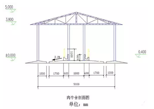 4、屋頂:最常用的是雙坡式屋頂。這種形式的屋頂可適用于較大跨度的牛舍,可用于各種規(guī)模的各類(lèi)牛群。這種屋頂既經(jīng)濟(jì),保溫性又好,而且容易施工修建。