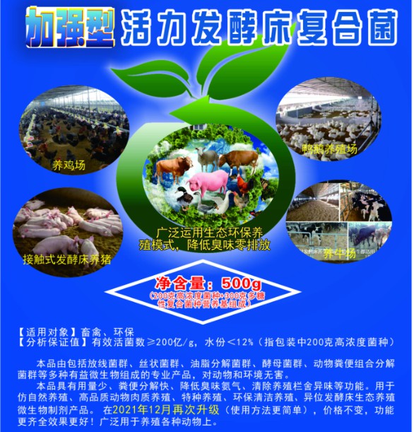 3.菌種每2-3個(gè)月補(bǔ)充一次,每100個(gè)平方米補(bǔ)充1包“加強(qiáng)型活力發(fā)酵床復(fù)合菌”的激活液即可。