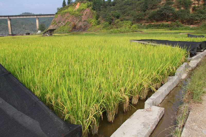 傳統(tǒng)稻田經(jīng)過標(biāo)準(zhǔn)化改造,硬化加高田基,使其高出田土表層40厘米以上,以利于保水保肥和抗旱減災(zāi),同時在田間開挖魚坑(黑色遮陽網(wǎng)膜覆蓋處)、魚溝(水稻邊行旁),使坑溝面積占田塊面積10%以上,增大稻田養(yǎng)殖水體,以利于提高魚產(chǎn)量。