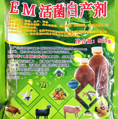 制作方法:將”EM活菌自產(chǎn)劑”包裝中粉劑與500-1000克紅糖與溶入40公斤約35℃的溫水中,簡(jiǎn)單攪拌然后密封放在室溫25℃以上的環(huán)境下進(jìn)行培養(yǎng),僅需24-48小時(shí)即可完成培養(yǎng),PH值在3.5左右,常溫下3個(gè)月內(nèi)每毫升含復(fù)合益生菌在100-300億,時(shí)間越長(zhǎng)菌種數(shù)量會(huì)隨之下降。密封可以保存一年以上,但3個(gè)月內(nèi)使用效果更好。
