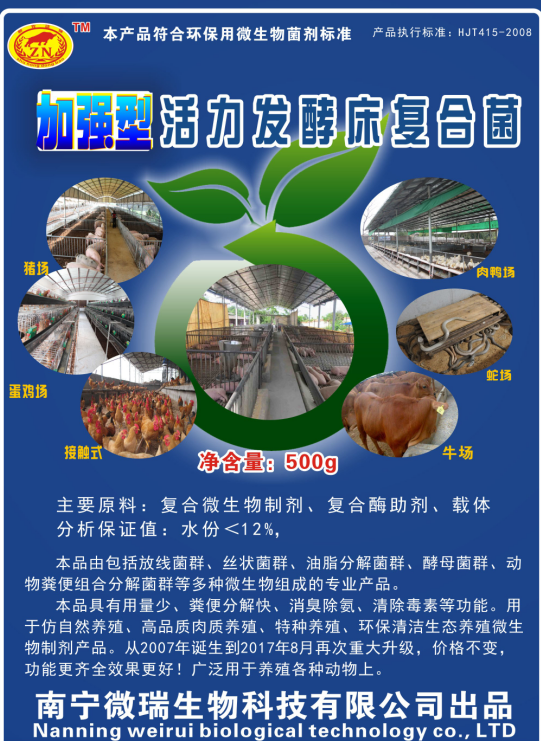 1.將新鮮無毒的干墊料(建議使用木屑、鋸末、蔗渣等,粉碎的玉米秸稈等也是可以使用的,但使用壽命只能一批肥豬更換1次)直接鋪在漏糞板區(qū)域(有特殊物質(zhì)的墊料如速生桉的鋸末墊料、谷殼等需要發(fā)酵至少一周以上后才能使用),墊料厚度為15-20厘米,北部低溫季節(jié)可以稍微提高厚度(不建議超過25厘米,墊料越厚越容易板結(jié));將產(chǎn)品“加強型活力發(fā)酵床復合菌”1包與5公斤玉米粉混合灑在30平方米的墊料上,噴水讓墊料含水量在40%左右簡單翻拌一下墊料,即可進豬飼養(yǎng)。(菌種不建議采用其他菌種,因為目前國內(nèi)可能只有“加強型活力發(fā)酵床復合菌”包含完整的放線菌群、絲狀菌群、油脂分解菌群、酵母菌群、動物糞便組合分解菌群,否則可能導致無法快速分解豬糞,且每平方米菌種成本僅2-3元,一般一批豬才補充一次菌種)。豬群進入前,引導豬不固定排糞(將豬糞尿潑灑到各個地方。這點很重要,要多想辦法解決后面管理就減少勞動量)。