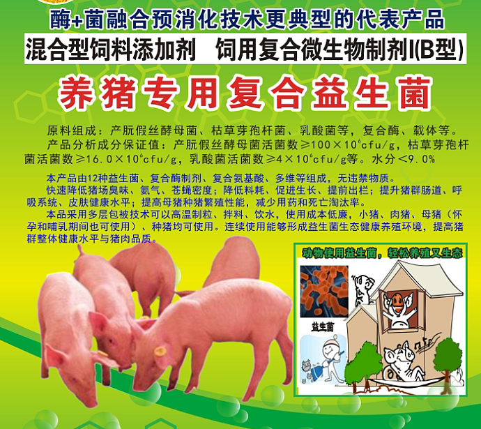 “養(yǎng)豬專用復(fù)合益生菌”1包拌料2-3噸,價(jià)格在40元以內(nèi)/包。