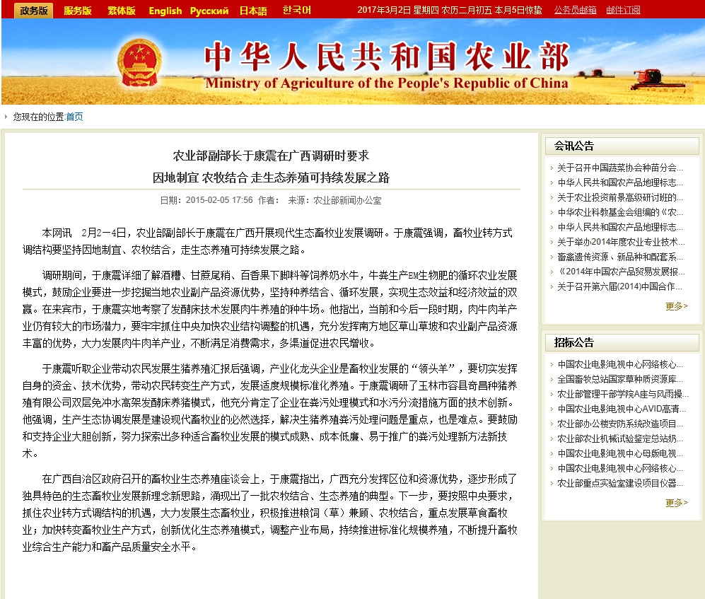 20152月,農(nóng)業(yè)部于康震副部長(zhǎng)提出,廣西要走特色的生態(tài)養(yǎng)殖路子作為全國(guó)獨(dú)特的試點(diǎn)省份。因此,廣西開(kāi)始全力推廣現(xiàn)代生態(tài)養(yǎng)殖技術(shù)模式。